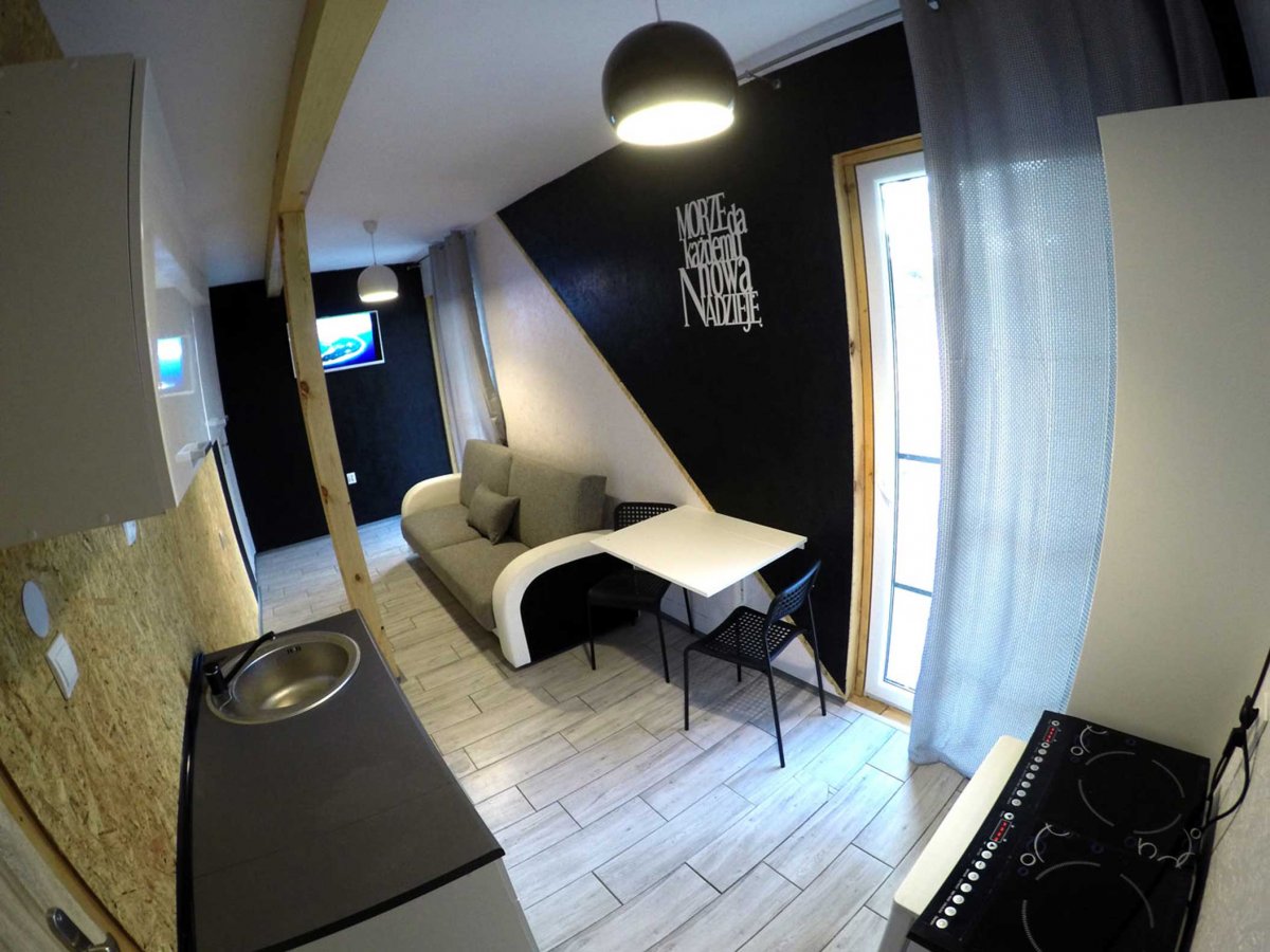 Dwie osoby bez możliwości dostawek. Do spania rozkładana sofa. Prywatna łazienka z prysznicem. Aneks kuchenny. Widok na wydmy. Idealny na wakacje na Helu dla pary.[tagi: noclegi hel, hel noclegi]